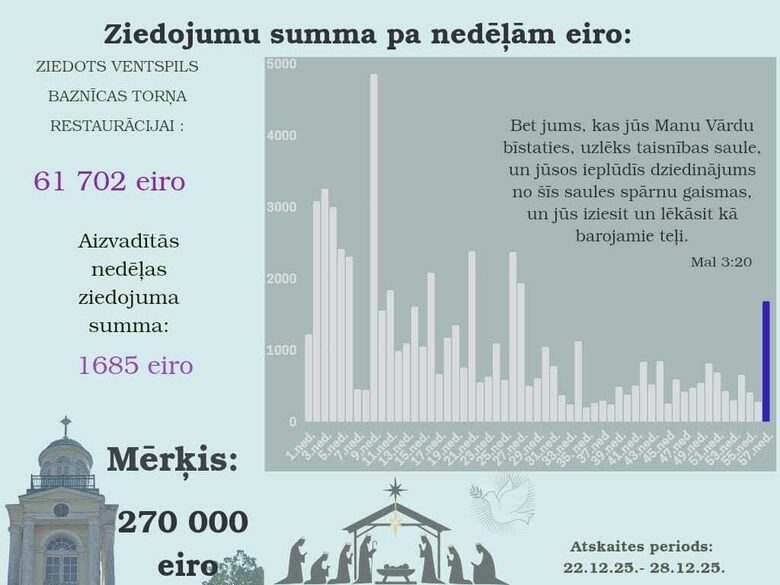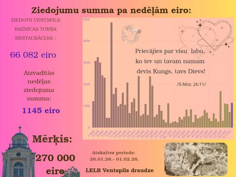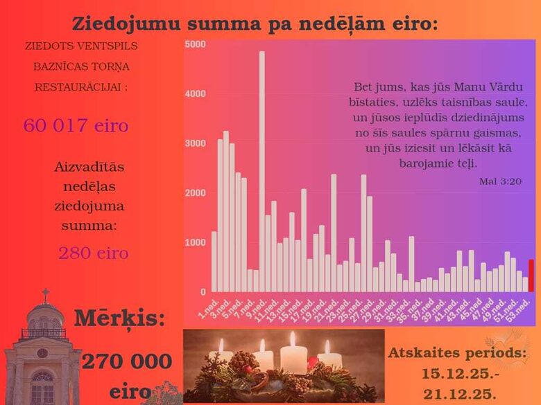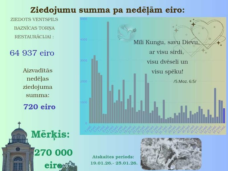 Ar pateicību Dievam un ikvienam draudzes loceklim dalāmies ar informāciju par ziedojumiem Ventspils luterāņu baznīcas torņa restaurācijai.